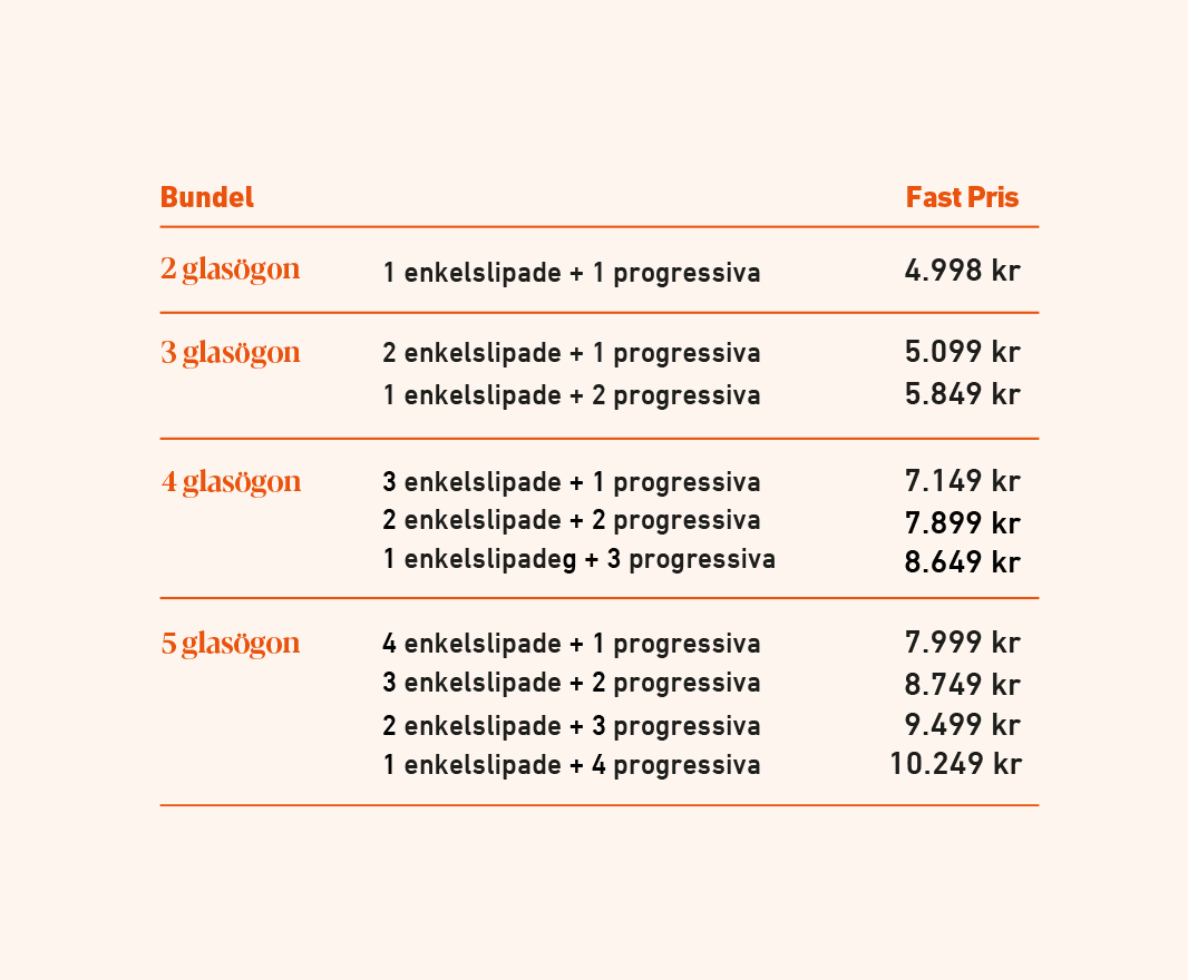Efter fem par kostar varje extra par enkelslipade glasögon 799 kr och progressiva glasögon 1.299 kr.